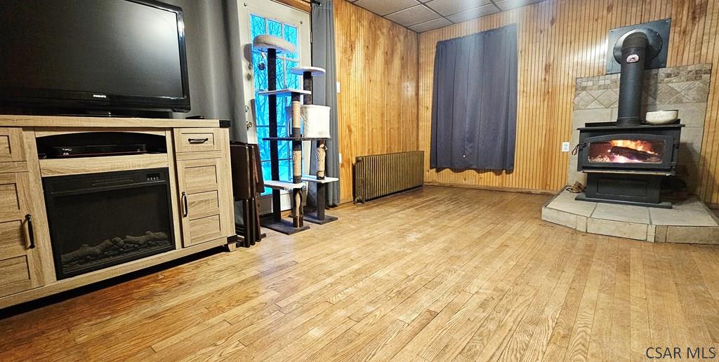 Living Room Description: Oak Floors, Wood Stove, Ceiling Fan